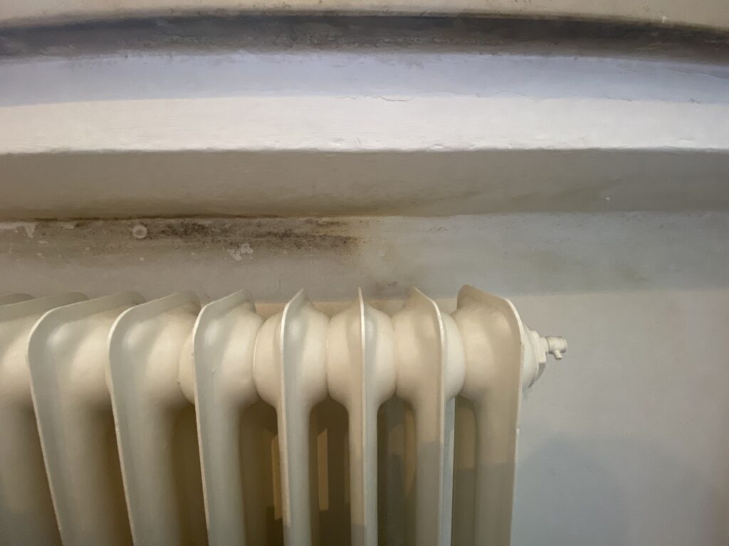 特に外壁の内側(窓や壁の角)などでは、結露が起こりやすく、カビが発生します(写真の当該箇所も窓下部分です)。